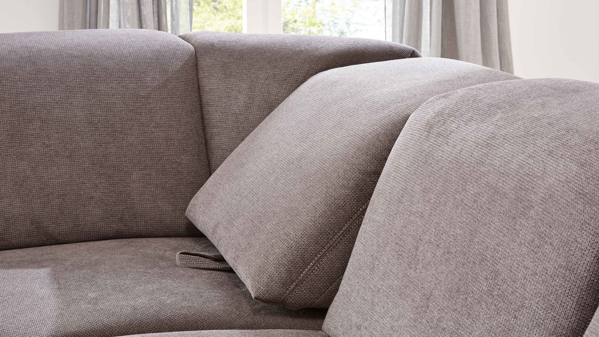 Der Relaxrücken ist ein komfortabler Funktions-Mehrpreis für Eckelemente aus dem Modulmaster-Polsterprogramm MM-ZE1106. Es handelt sich um eine manuelle Relaxfunktion für beide Seiten des Elements. Indem Sie die Rückenlehne mit der Schlaufe leicht nach oben und vorn ziehen, stellen Sie den Neigungswinkel schräg zur Relaxposition.