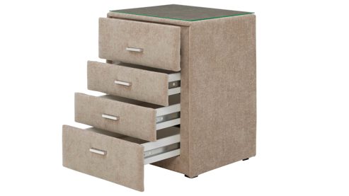 Der beige Chenillebezug verleiht der Nachtkonsole eine warme, wohnliche Ausstrahlung und sorgt gleichzeitig für eine angenehme Haptik. Die elegante Klarglasauflage setzt einen modernen Akzent und schützt die Oberfläche – ideal für Lampe, Bücher oder dein Smartphone. Die vier leichtgängigen Schubladen mit chromfarbenen Griffen bieten dir ausreichend Platz für alles, was du griffbereit haben möchtest.