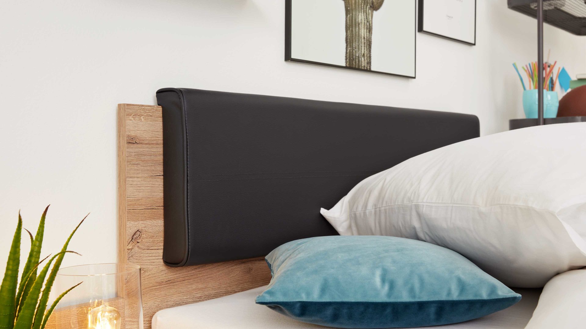 Das Bettgestell 5767 aus der Interliving Jugendzimmer Serie 1701 kombiniert edle Risseiche-Nachbildung mit einem Polsterkopfteil in anthrazitfarbenem Kunstleder.