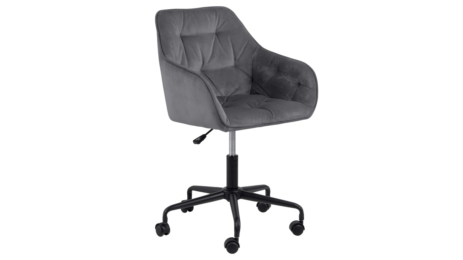 Dabei harmoniert der Drehstuhl in seiner sanften Formensprache mit zahlreichen Einrichtungsstilen: Dafür sorgt der dunkelgraue Samtbezug, der die gesamte Sitzschale inklusive der bequemen Armlehnen weich umhüllt. Das pulverbeschichtete Metall-Drehkreuz fließt in mattem Schwarz stimmig in das Gesamtbild ein.