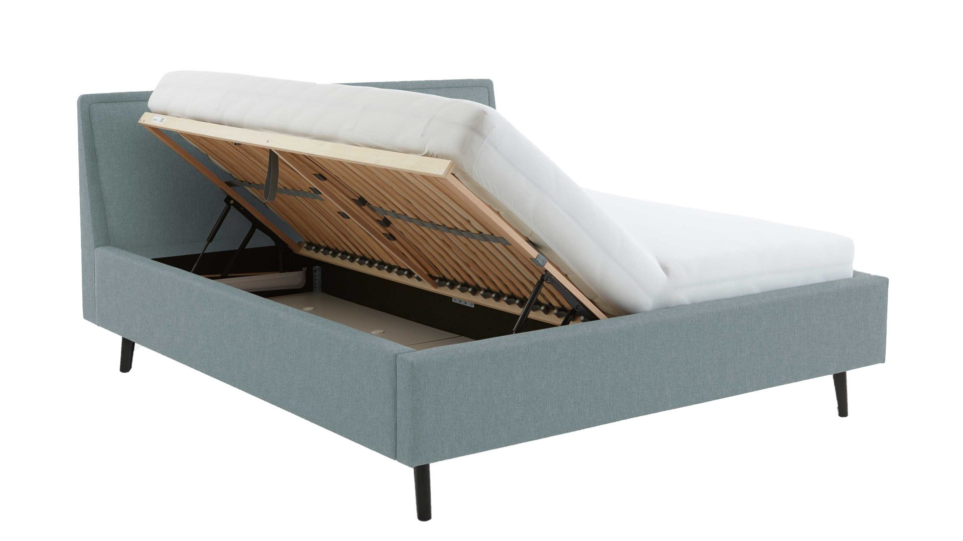 Das Polsterbettgestell Frieda mit Bettkasten verkörpert modernen Komfort. Mit dem eisblauen Stoffbezug und den schwarzen Holzfüßen präsentiert es sich elegant und gemütlich designt. Die Bettseiten sind genauso wie das Polsterkopfteil glatt bezogen. Letzteres ist eine angenehm weiche Rückenlehne, wenn Sie abends im Bett vor dem Schlafen noch entspannt in Ihrem Buch lesen oder fernsehen möchten.