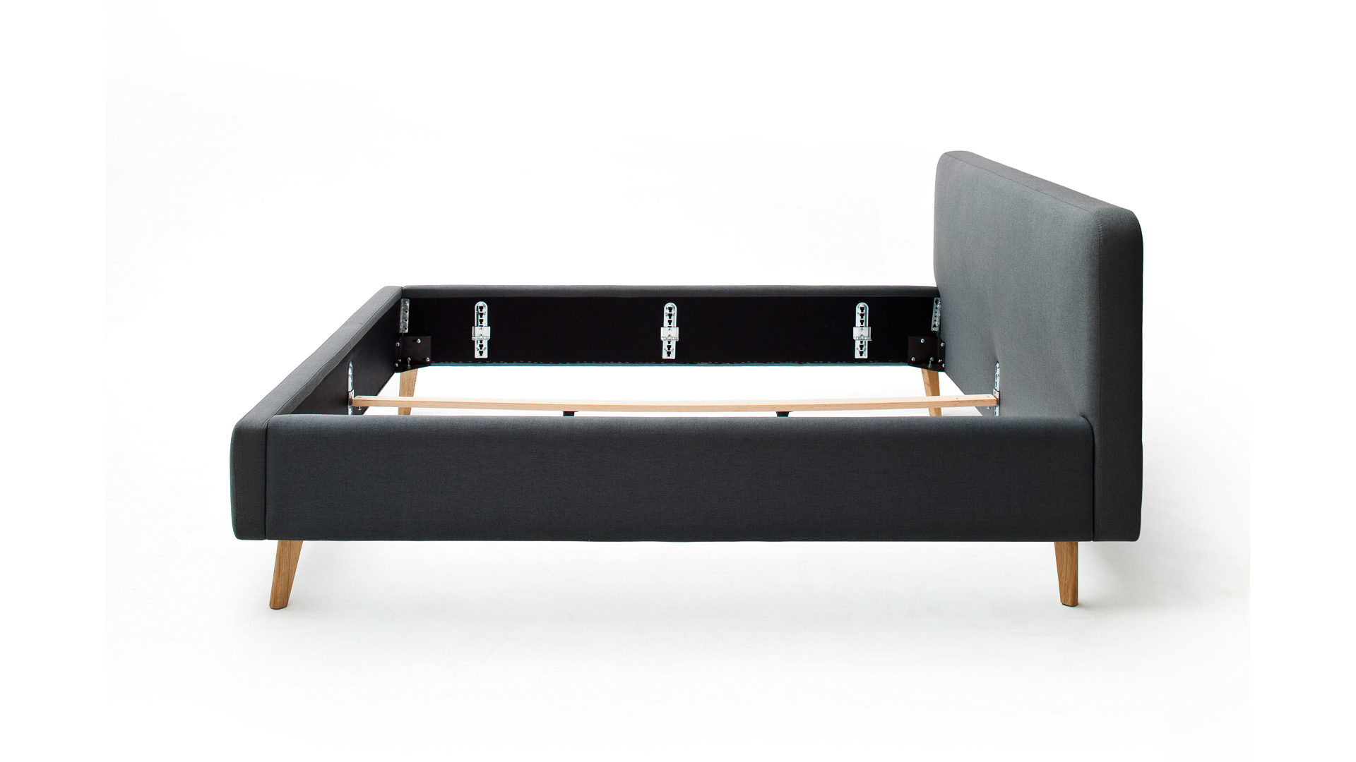 Das Polsterbettgestell Mattis begeistert durch die elegante Optik sowie die hervorragende Material- und Verarbeitungsqualität. Es kombiniert einen anthrazitfarbenen Flachgewebe-Bezug mit eichefarbenen Holzfüßen. Sowohl die Bettseiten als auch das Polsterkopfteil sind glatt bezogen. Letzteres lädt Sie ein, sich anzulehnen, wenn Sie abends im Bett vor dem Schlafen noch fernsehen oder in einem Buch lesen.