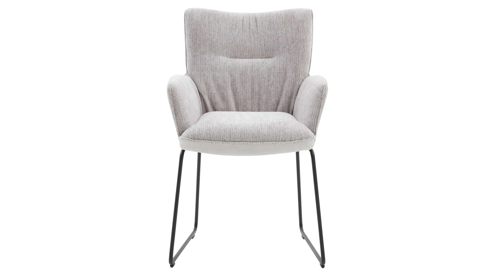 Der moderne Schalensessel 9032-04-959 aus der Interliving Esszimmer Serie 5111 kombiniert ein schwarzes Eisen-Kufengestell mit einer stilvollen platinfarbenen Bezugkombination.