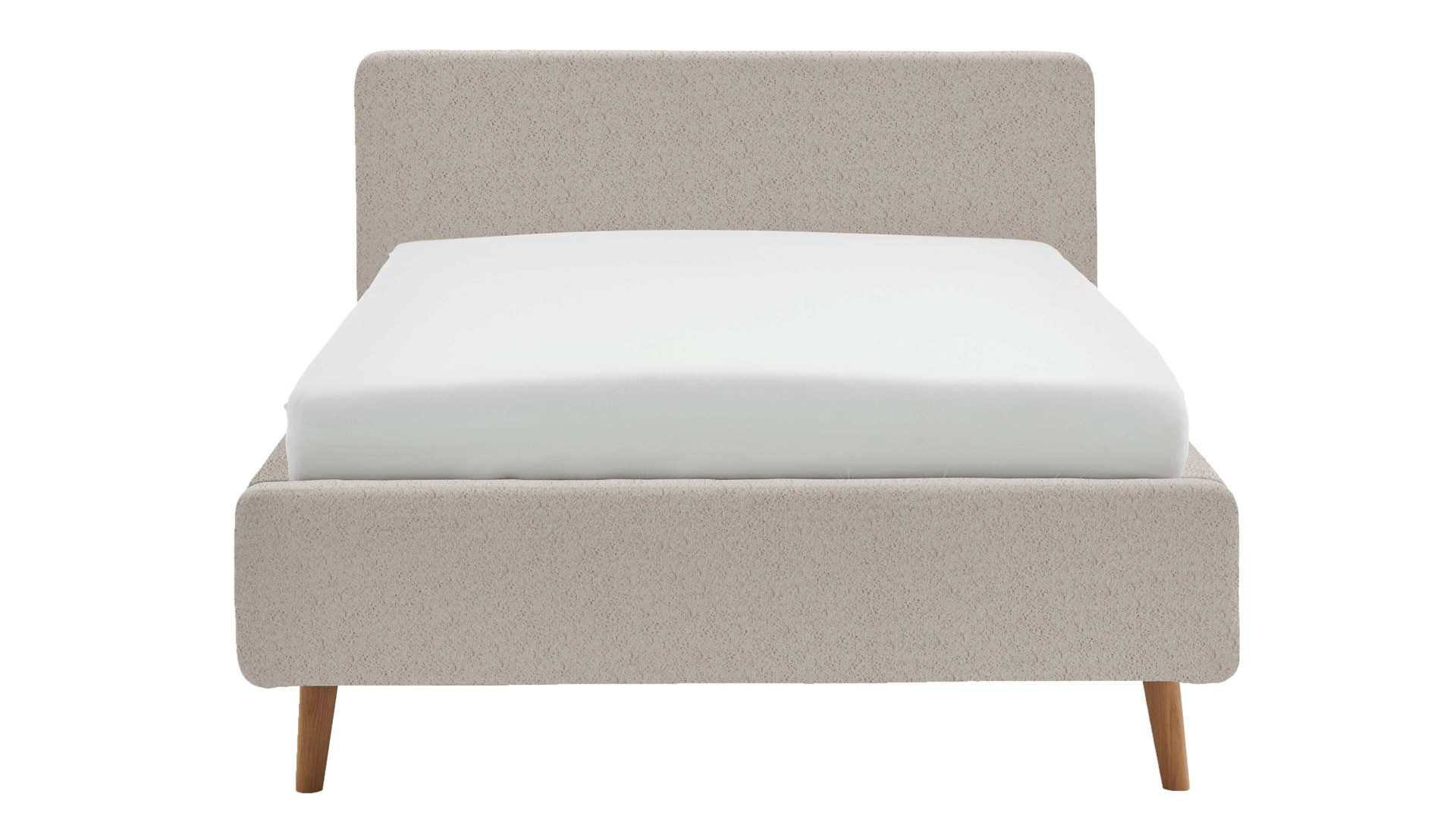 Das Polsterbettgestell Mattis begeistert durch die elegante Optik sowie die hervorragende Material- und Verarbeitungsqualität. Es kombiniert einen beigefarbenen Boucle-Bezug mit eichefarbenen Holzfüßen. Sowohl die Bettseiten als auch das Polsterkopfteil sind glatt bezogen. Letzteres lädt Sie ein, sich anzulehnen, wenn Sie abends im Bett vor dem Schlafen noch fernsehen oder in einem Buch lesen.