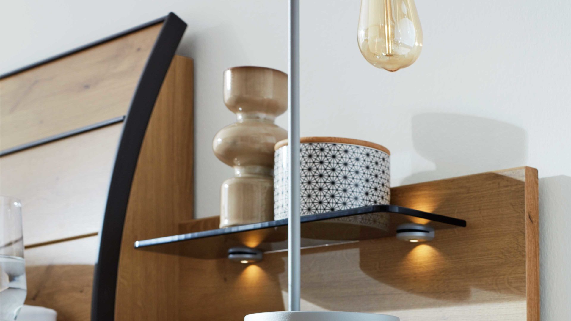Natürlich & modern zugleich: Die Kombination aus Bianco Eiche Nachbildung und einer edlen Rauchglasablage sorgt für warme, zeitgemäße Leichtigkeit. Das Paneel harmoniert perfekt mit weiteren Möbeln der Serie 1205 und fügt sich nahtlos in unterschiedliche Schlafzimmerstile ein.