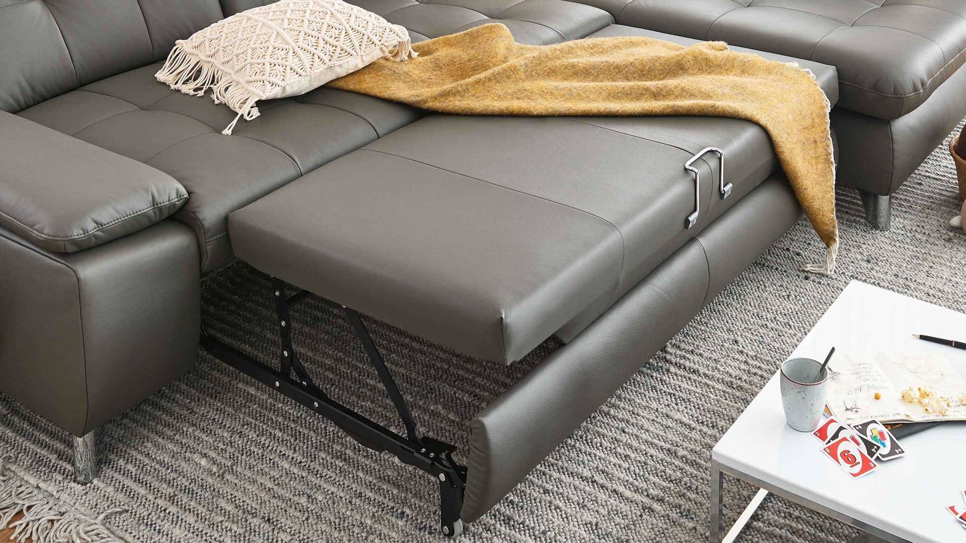 • Die Abbildung zeigt ein Wohnbeispiel, welches auch Dekoration sowie separat erhältliches Zubehör enthält. Im Lieferumfang enthalten ist der Mehrpreis für eine lederbezogene Liegefläche.