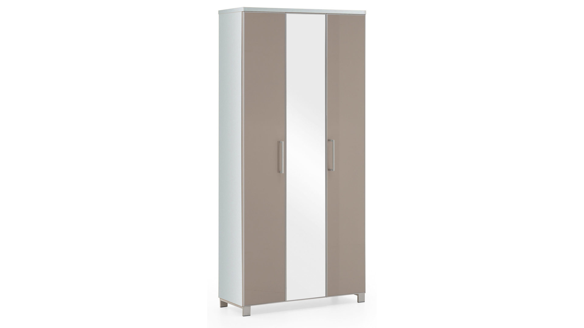 So wie bei diesem VOSS MÖBEL Dielenschrank Santina mit Spiegel. Modernes Design und Funktionalität gehen hier Hand in Hand. Der Garderobenschrank hat einen weiß lackierten Korpus und taupefarbene Glasfronten mit einer Spiegelauflage. Hinter der linken Holztür verstecken sich sieben Schuhgitter, die Stiefel, High Heels und Turnschuhe geschmackvoll aufbewahren, auf der anderen Seite erwartet Sie ein großes Fach, in dem Sie Jacken und Mäntel aufbewahren können.