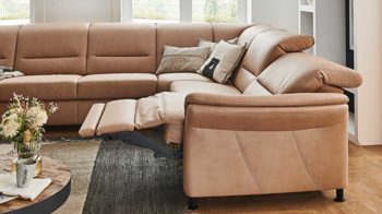 Das Programm bietet eine beeindruckende Typen- und Bezugvielfalt, wobei alle Rückseiten im Originalstoff bezogen sind und die Bezüge wahlweise mit oder ohne Kontrastnaht umgesetzt werden können. Überdies stehen sieben Fußvarianten, zwei preisgleiche Sitzhöhen und mit Kaltschaum, Federkern und - gegen Aufpreis - Boxspring drei Sitzqualitäten zur Wahl.