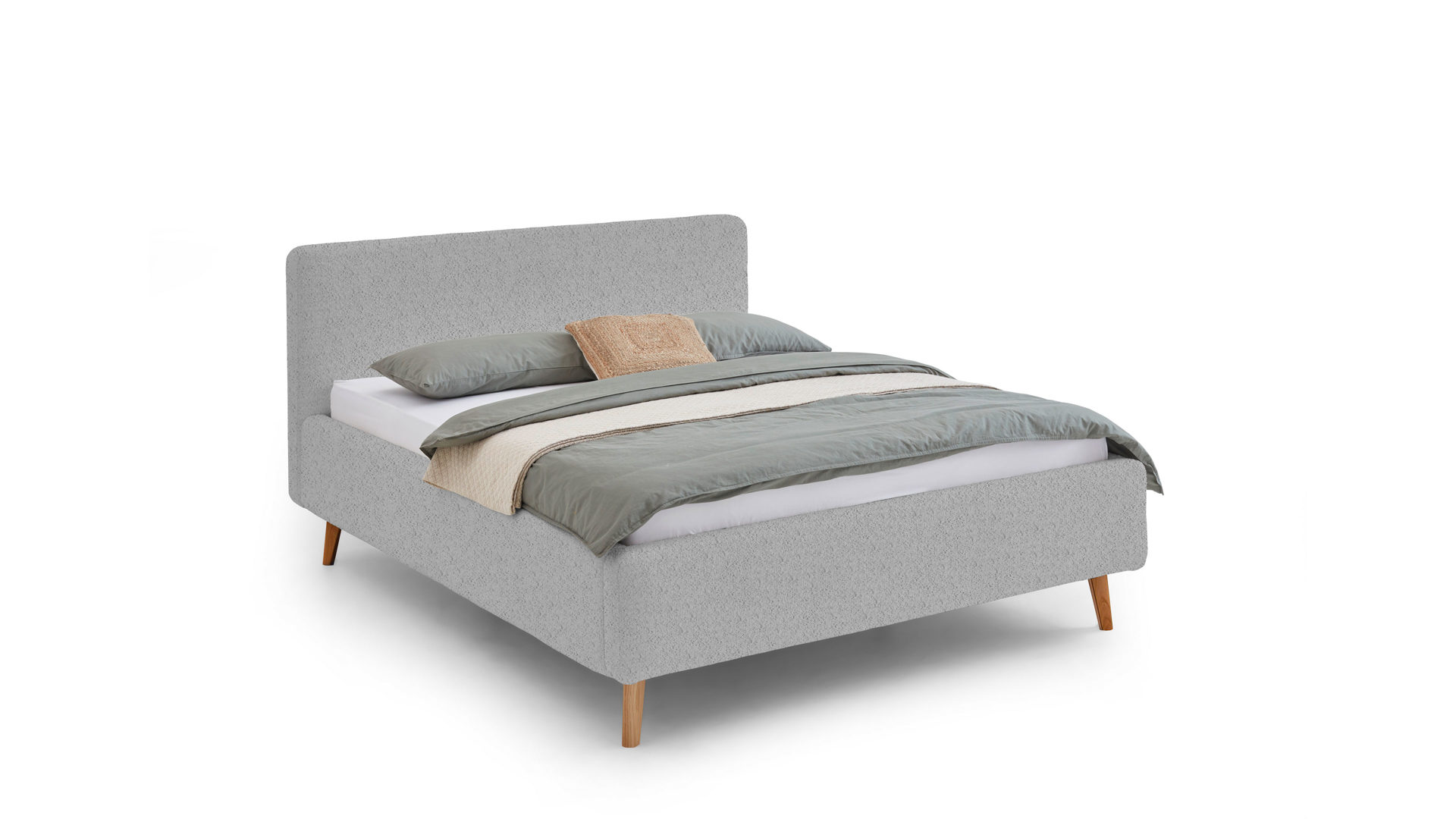 Das Polsterbettgestell Mattis begeistert durch die elegante Optik sowie die hervorragende Material- und Verarbeitungsqualität. Es kombiniert einen grauen Boucle-Bezug mit eichefarbenen Holzfüßen. Sowohl die Bettseiten als auch das Polsterkopfteil sind glatt bezogen. Letzteres lädt Sie ein, sich anzulehnen, wenn Sie abends im Bett vor dem Schlafen noch fernsehen oder in einem Buch lesen.