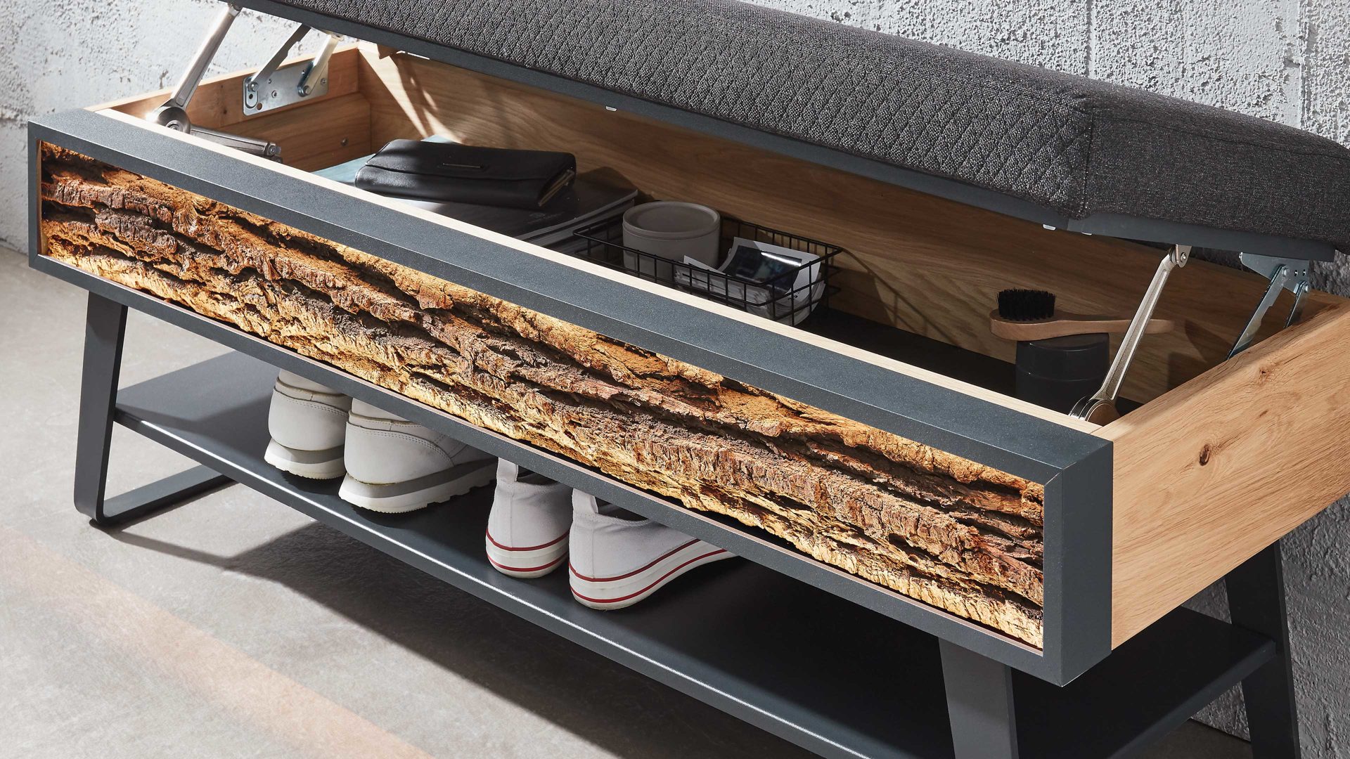 Die Garderobenbank Runa verbindet massive Kerneiche, Rindenholz sowie anthrazitfarbenes Metall und einen ebenfalls anthrazitfarben gestalteten Stoff zu einem robusten, modernen und eindrucksvollen Ganzen.