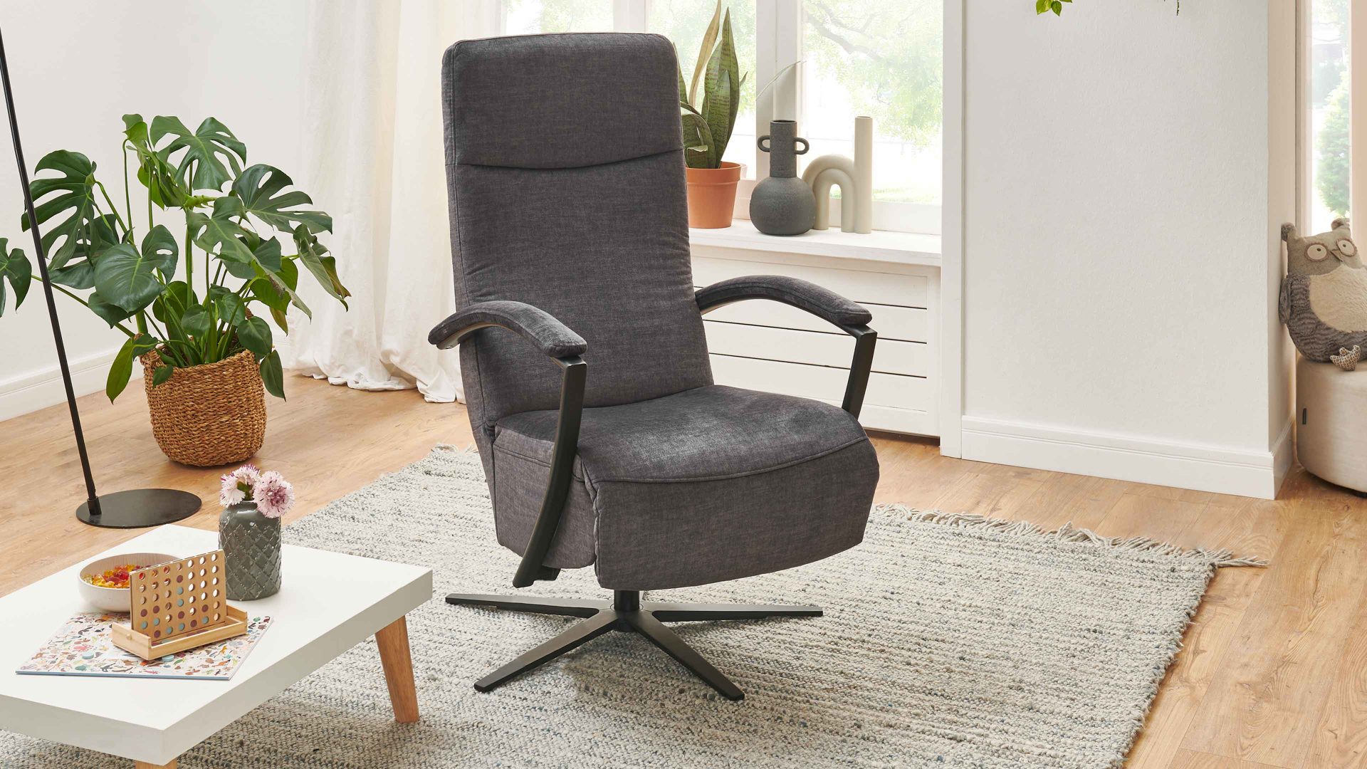 Das Highlight des Sessels bildet die manuelle Relaxfunktion: Leichter Körperdruck führt dazu, dass sich der Rücken senkt. Dabei geht der Sitz automatisch nach vorn und oben. Parallel fährt die Beinauflage nach oben bis in die Relaxposition. Zudem begeistern das einfach per Hand stufenlos verstellbare Kopfteil mit Rasterbeschlag, Rückholfeder und Faltenoptimierung sowie die Drehbarkeit um 360 Grad.