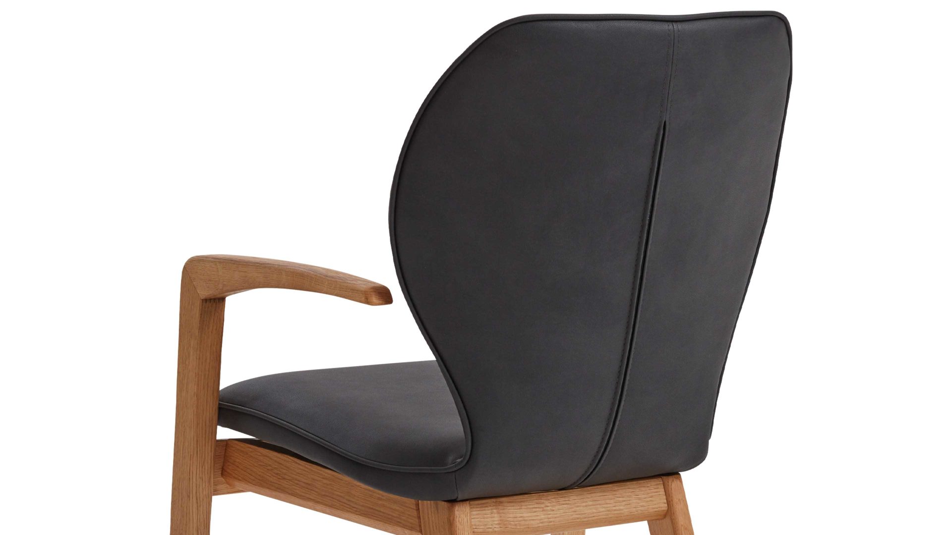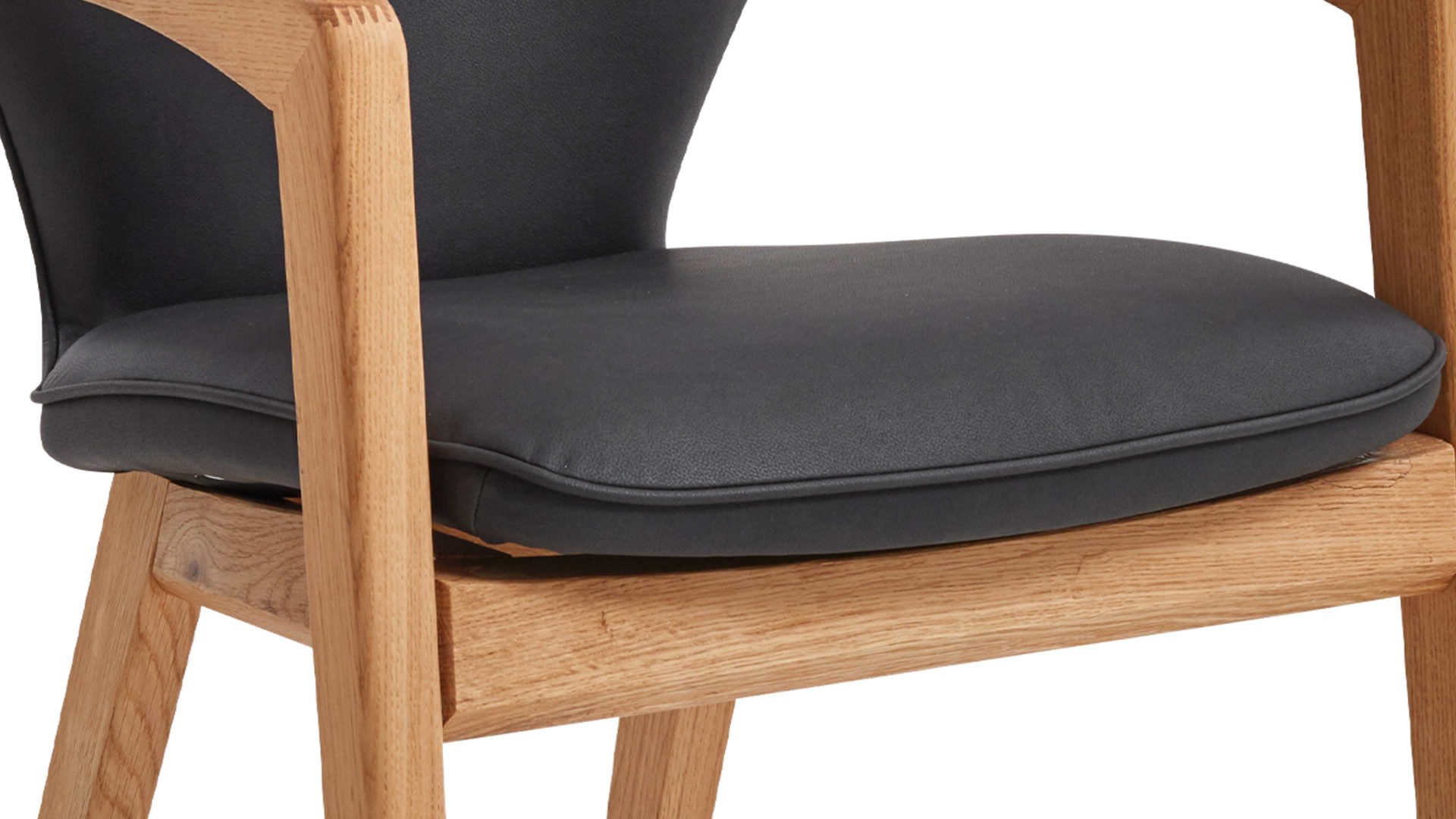 Das massive Eiche-Vierfußgestell verleiht dem Stuhl nicht nur Stabilität, sondern auch eine natürliche und warme Ausstrahlung. Die Kombination aus dem dunklen Bezug und dem hellen Holz schafft einen ansprechenden Kontrast, der sich nahtlos in verschiedene Einrichtungsstile einfügt.