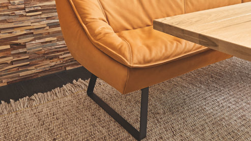 sonnengelber Lederbezug mit einer beigen Kontrastnaht und mattschwarzen Metallkufen