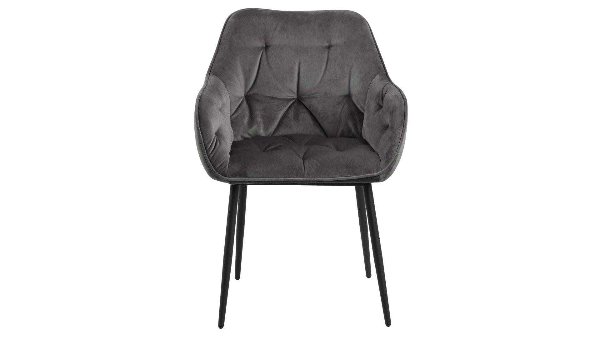 Dabei harmoniert der Polsterstuhl in seiner sanften Formensprache mit zahlreichen Einrichtungsstilen. Moderne Geradlinigkeit ergänzt er ebenso stimmig wie den beliebten Vintage-Trend. Auch farblich erlaubt der Esszimmerstuhl Brooke angenehme Freiheit beim Kombinieren: Dafür sorgt der dunkelgraue Bezug aus Samt, der die gesamte Sitzschale inklusive der bequemen Armlehnen weich umhüllt. Die rau pulverbeschichteten Metallfüße fließen in mattem Schwarz stimmig in das Gesamtbild ein.