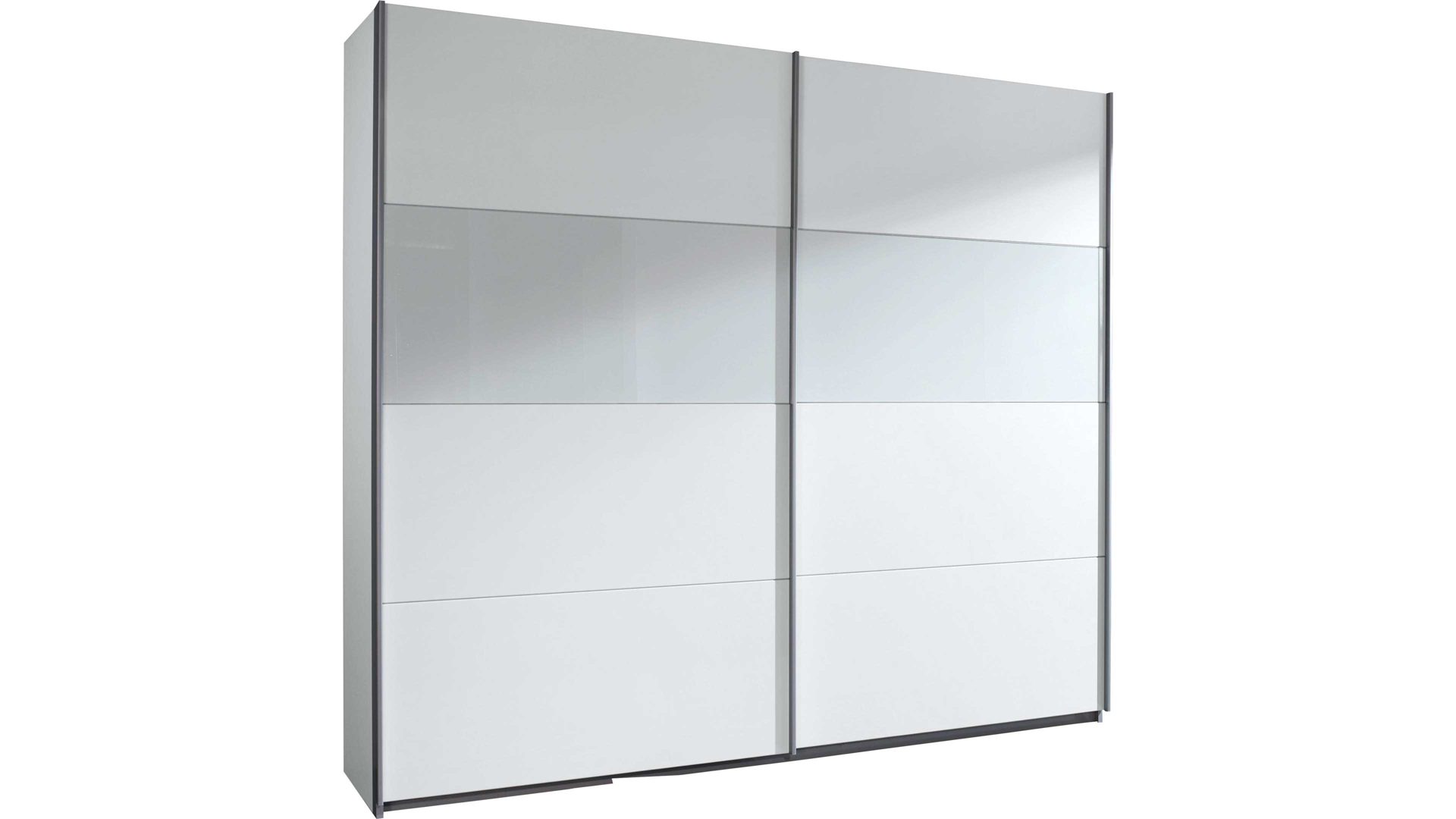 Das Modell verfügt über insgesamt zwei alpinweiße Türen, die mittig einen alpinweißen Glaseinsatz haben. Der Schwebetürenschrank bietet mit Maßen von ca. 271 x 210 x 57 cm (BxHxT) viel Platz.
