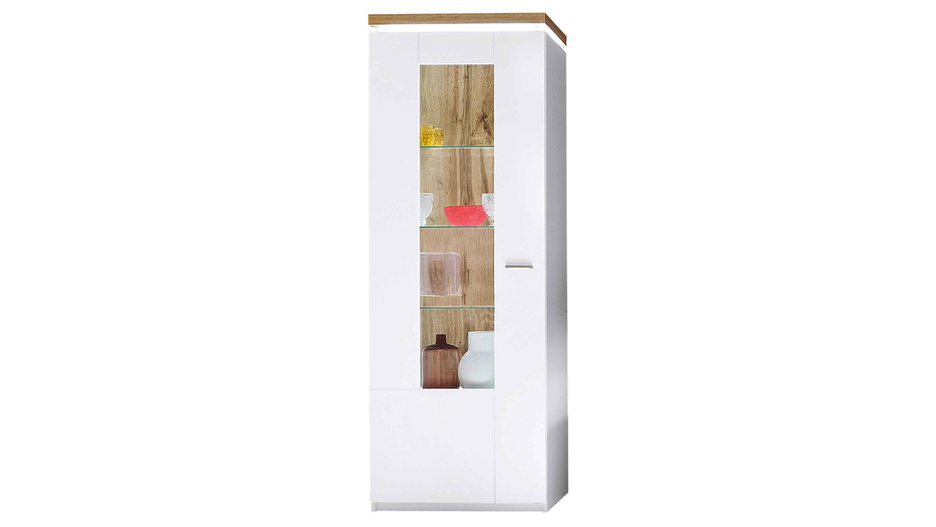 Die eintürige Standvitrine mit Glaseinsatz beherbergt einen Holz- und drei Glasböden. Gerade auf den Böden hinter dem Klarglaseinsatz kommen schöne Dekoelemente wunderbar zur Geltung.