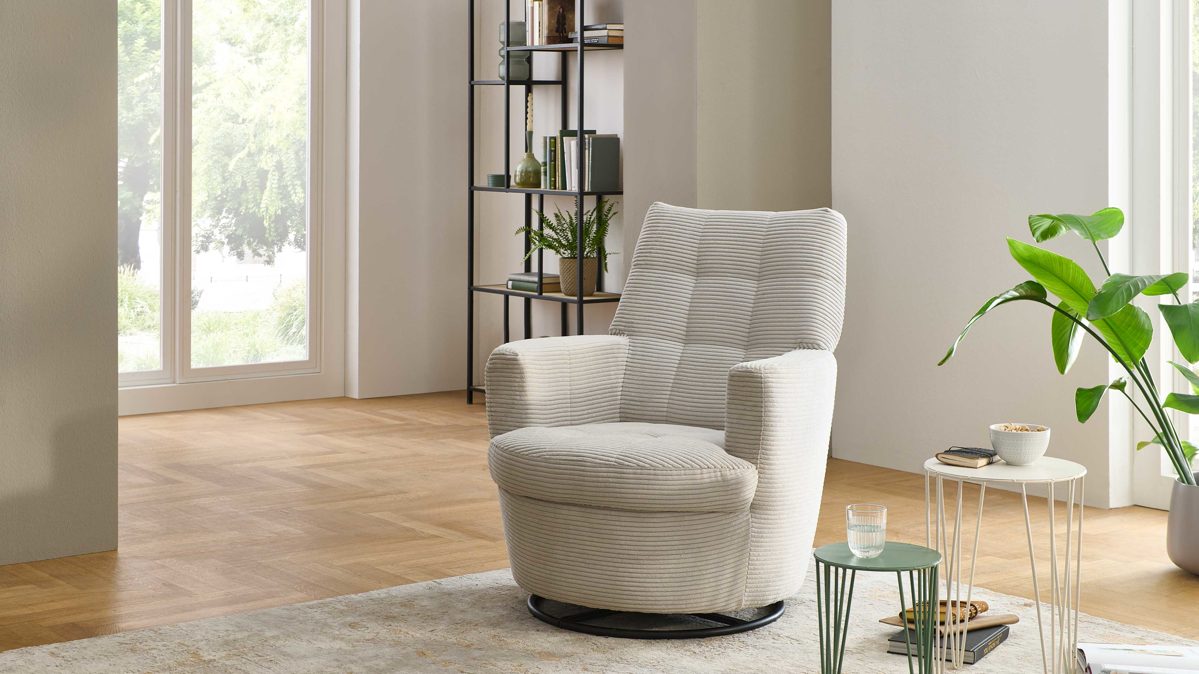 Mit dem hellgrauen Feincordbezug, der edel gesteppten Sitzfläche und dem mattschwarzen Metallfußring präsentiert sich der KAWOO Relaxsessel SE 53 modern, elegant und gemütlich.