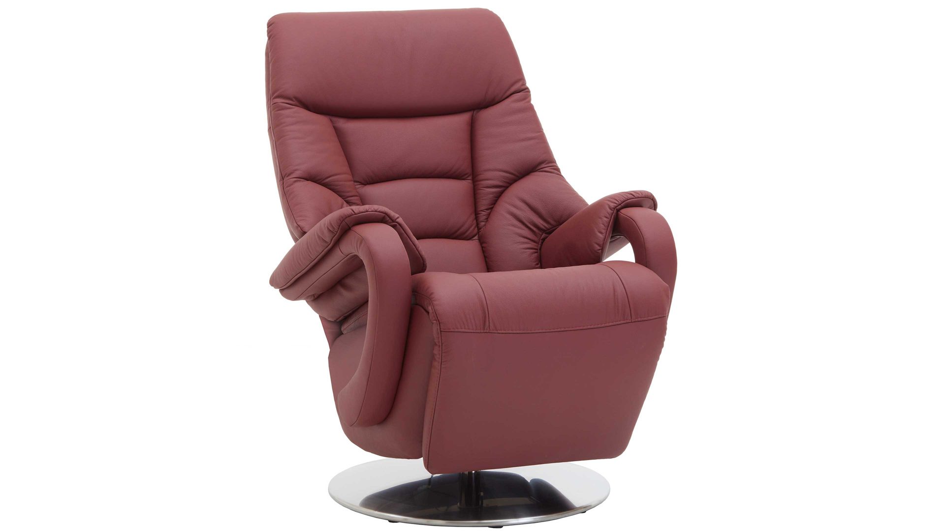 Dieser Relaxsessel kombiniert einen robusten glänzenden Edelstahl-Tellerfuß mit einem stilvollen merlotfarbenen Lederbezug. Durch die optimal aufeinander abgestimmten Materialien und Farben strahlt der Fernsehsessel moderne Eleganz aus. Für die nötige Stabilität sorgt der Stahlrohrrahmen. Er macht den TV-Sessel bis 130 kg belastbar. Die Maße des hochwertig verarbeiteten Relaxsessels belaufen sich auf ca. 80 x 116 x 80 cm (BxHxT), bei einer Sitzhöhe von ca. 49 cm und einer Sitztiefe von ca. 55 cm.