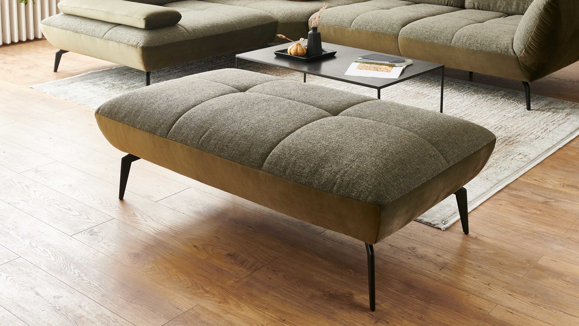 Die spezielle Kombination aus oliv- und khakifarbenen Stoffbezügen sorgt für ein edles Design. Mattschwarze Metallfüße runden die Optik stimmig ab und tragen überdies zur Stabilität des attraktiven Hockers bei. Einen gelungenen Akzent setzt die gesteppte Sitzfläche. Der Korpus des XXL-Hockers ist glatt bezogen.