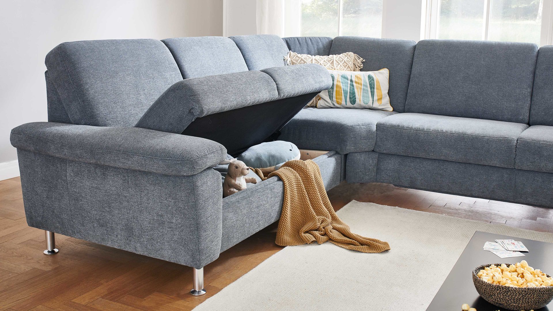 Dieser Bettkasten ist eine Mehrpreis-Funktion für die 2,5-Sitzer aus dem Modulmaster Programm MM-ZE1129. Dank seiner im originalen Stoff der Couch bezogenen Front fügt er sich absolut harmonisch ins Gesamtbild ein. Innen ist der aufklappbare Stauraum weiß beschichtet. Er bietet Ihnen eine praktische Aufbewahrungsmöglichkeit für Textilien wie Decken und Zierkissen, aber auch für Spiele, Kinderspielzeug und andere Gegenstände.