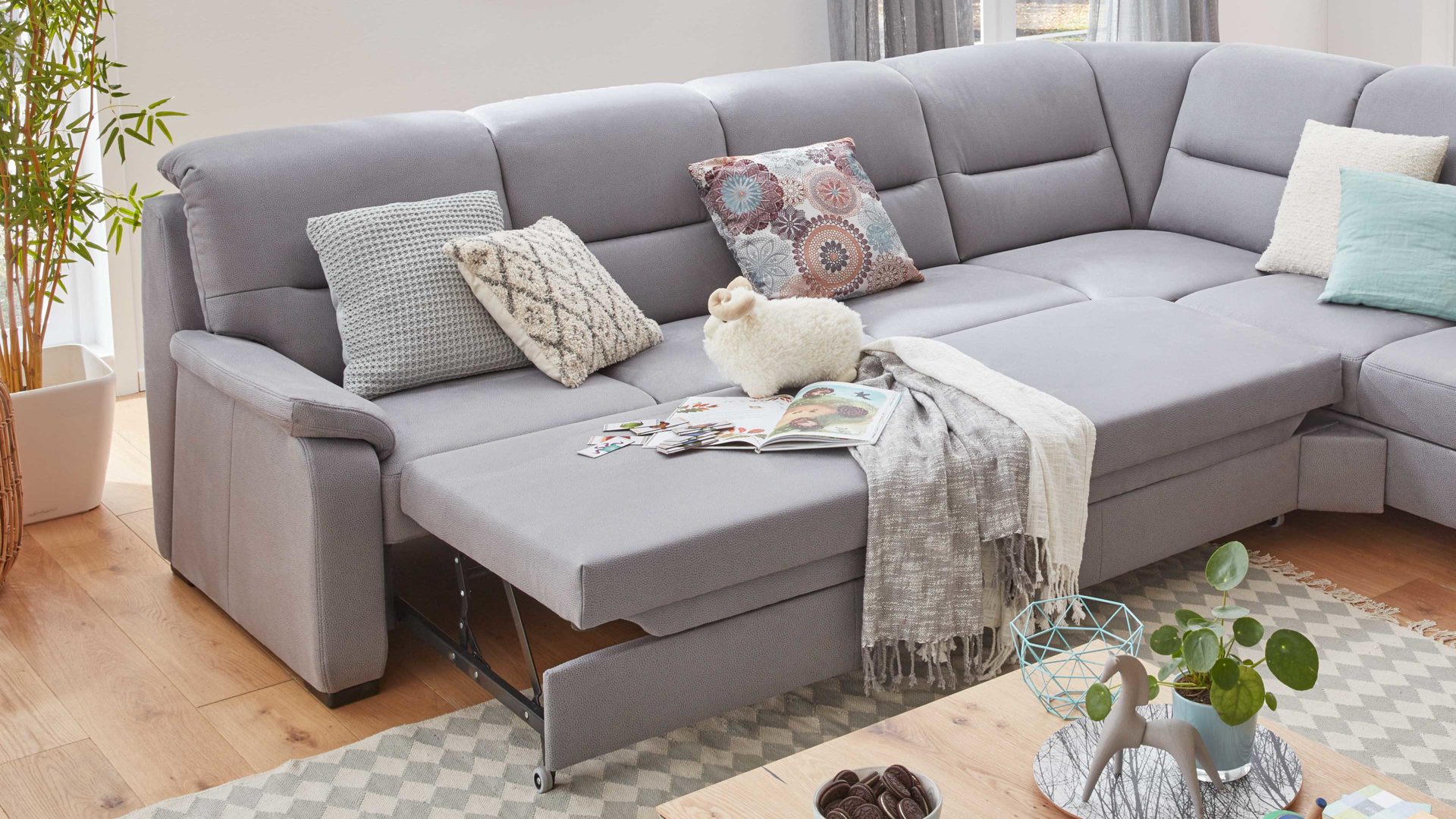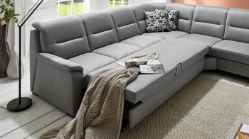 Die Schlaffunktion ist als praktisches Mehrpreis-Extra für jene Dreisitzer des Modulmaster-Modells MM-PP1009 erhältlich, die mit einer Armlehne ausgestattet sind und mit einer Trapezecke verbunden werden. Mithilfe des stilvollen silberfarbenen Metallgriffs lässt sich die Couch schnell und einfach nach vorne ausziehen, sodass sich ein gemütliches Gästebett ergibt.