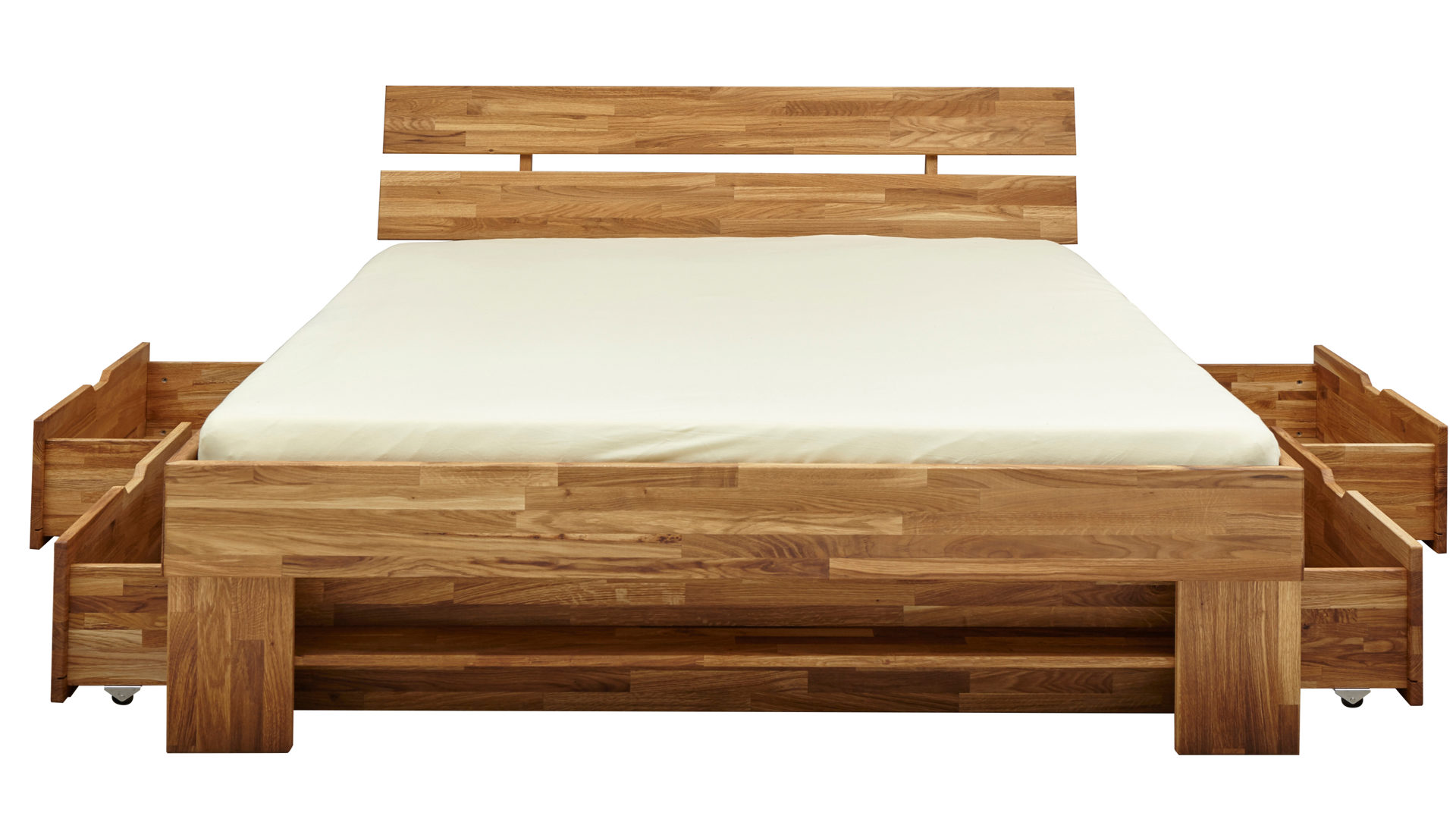 Lattenrahmen und Matratzen sind nicht im Preis inbegriffen. Allerdings können Sie beide Elemente in vielfältigen Varianten in der Shoppingwelt bestellen. Als Ergänzung zum Massivholz-Bettgestell ist eine passende Nachtkonsole erhältlich.