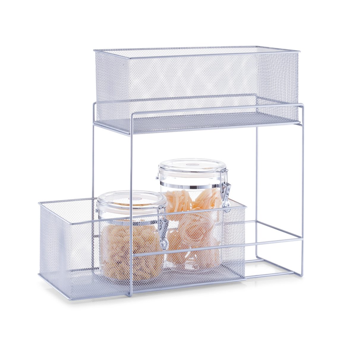 Dank diesem praktischen Etagenregal aus Stahlgeflecht mit zwei Körben aus Mesh gewinnen Sie wertvollen Stauraum in Ihrem Zuhause. Es schafft Ordnung in Ihren Schränken und Regalen und eignet sich ideal für den Einsatz in den Küchen-, Vorrats- oder Badschränken.