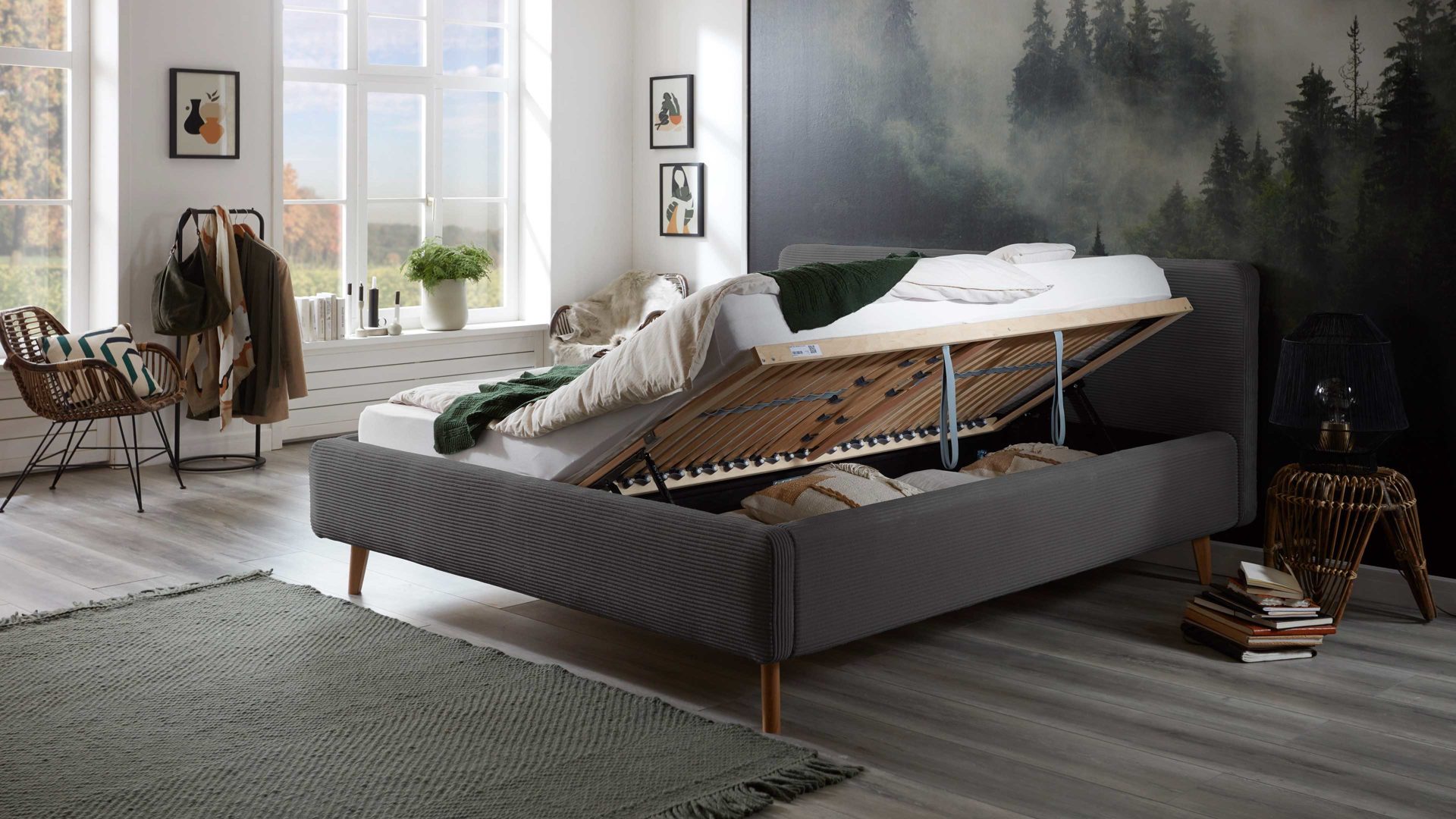 anthrazitfarbener Breitcord Poso 34 & Holzfüße - Liegefläche ca. 180 x 200 cm