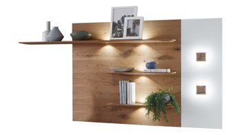 Links befindet sich eine Tür mit Mattglas und den zwei Hirnholz-Applikationen und rechts eine Mattglastür mit Klarglas-Ausschnitt. Hinter diesem Ausschnitt kommen schöne Dekoelemente besonders gut zur Geltung. Der linke Bereich beherbergt vier Holzböden, der rechte einen Holz- und einen Glasboden. Auf ca. 89 x 138 x 39 cm (BxHxT) belaufen sich die Maße des trendigen Stauraumschranks. Optional können Sie die Vitrine mit einer stimmungsvollen LED-Beleuchtung ergänzen.