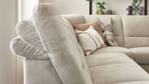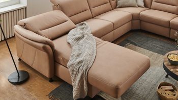 Das Programm bietet eine beeindruckende Typen- und Bezugvielfalt, wobei alle Rückseiten im Originalstoff bezogen sind und die Bezüge wahlweise mit oder ohne Kontrastnaht umgesetzt werden können. Überdies stehen sieben Fußvarianten, zwei preisgleiche Sitzhöhen und mit Kaltschaum, Federkern und - gegen Aufpreis - Boxspring drei Sitzqualitäten zur Wahl.