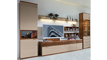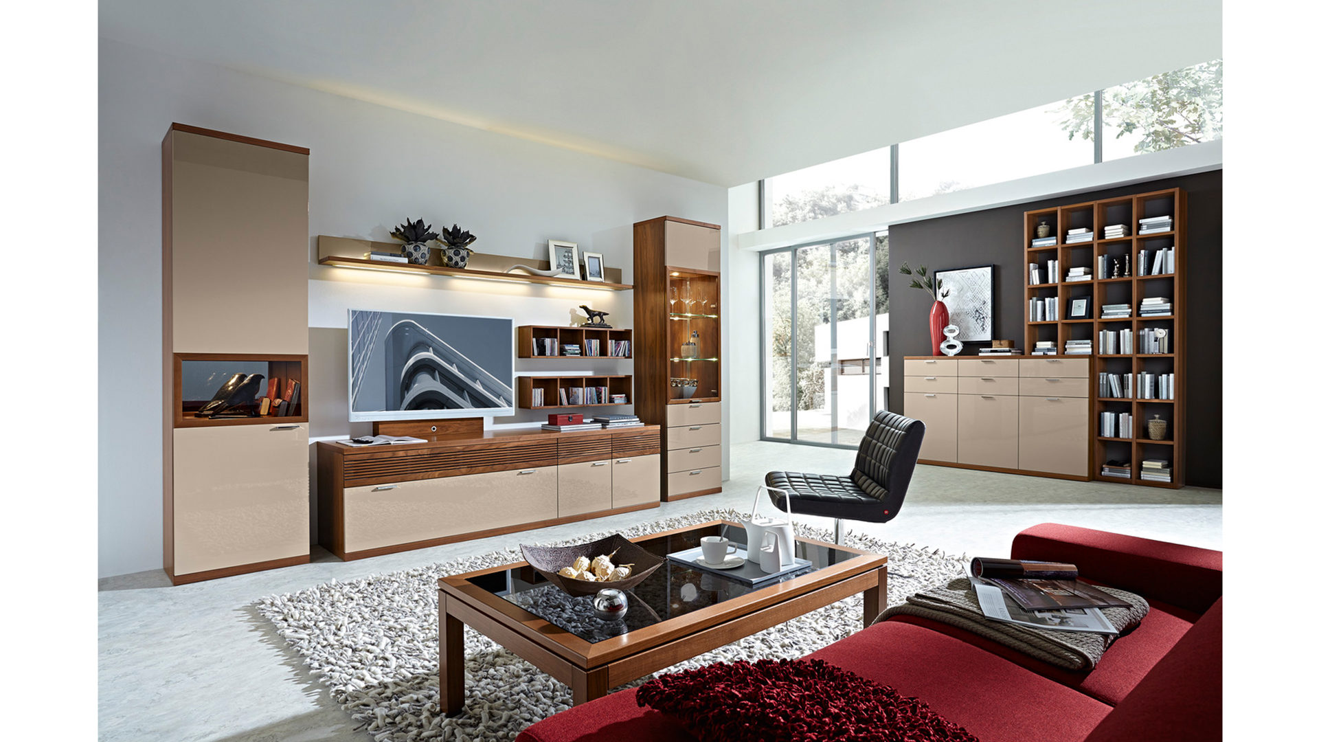 Die Venue Wohnkombination begeistert mit cappuccinofarbenen Mattlackoberflächen und Akzenten in noblem Nussbaumfurnier. Durch die erdige Farbgebung strahlt die Wohnwand wunderbar warmen, natürlich anmutenden Charme aus. Für eine stimmig-moderne Abrundung sorgen die glänzend verchromten Metallgriffe.
