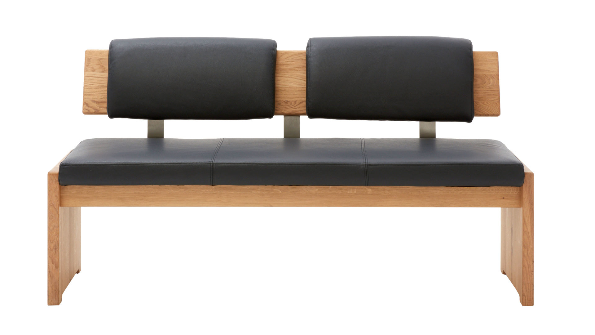 krähenfarbener Lederbezug, kombiniert mit einer grauen Kontrastnaht, naturfarbenem Wildeichefurnier und edelstahlfarbenem Stahl