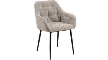 Dabei harmoniert der Polsterstuhl in seiner sanften Formensprache mit zahlreichen Einrichtungsstilen. Moderne Geradlinigkeit ergänzt er ebenso stimmig wie den beliebten Vintage-Trend. Auch farblich erlaubt der Esszimmerstuhl Brooke angenehme Freiheit beim Kombinieren: Dafür sorgt der Bezug in Beige, der die gesamte Sitzschale inklusive der bequemen Armlehnen umhüllt. Die rau pulverbeschichteten Metallfüße fließen in mattem Schwarz stimmig in das Gesamtbild ein.