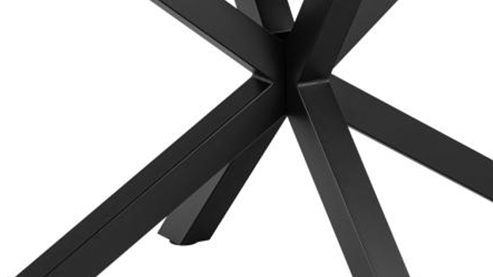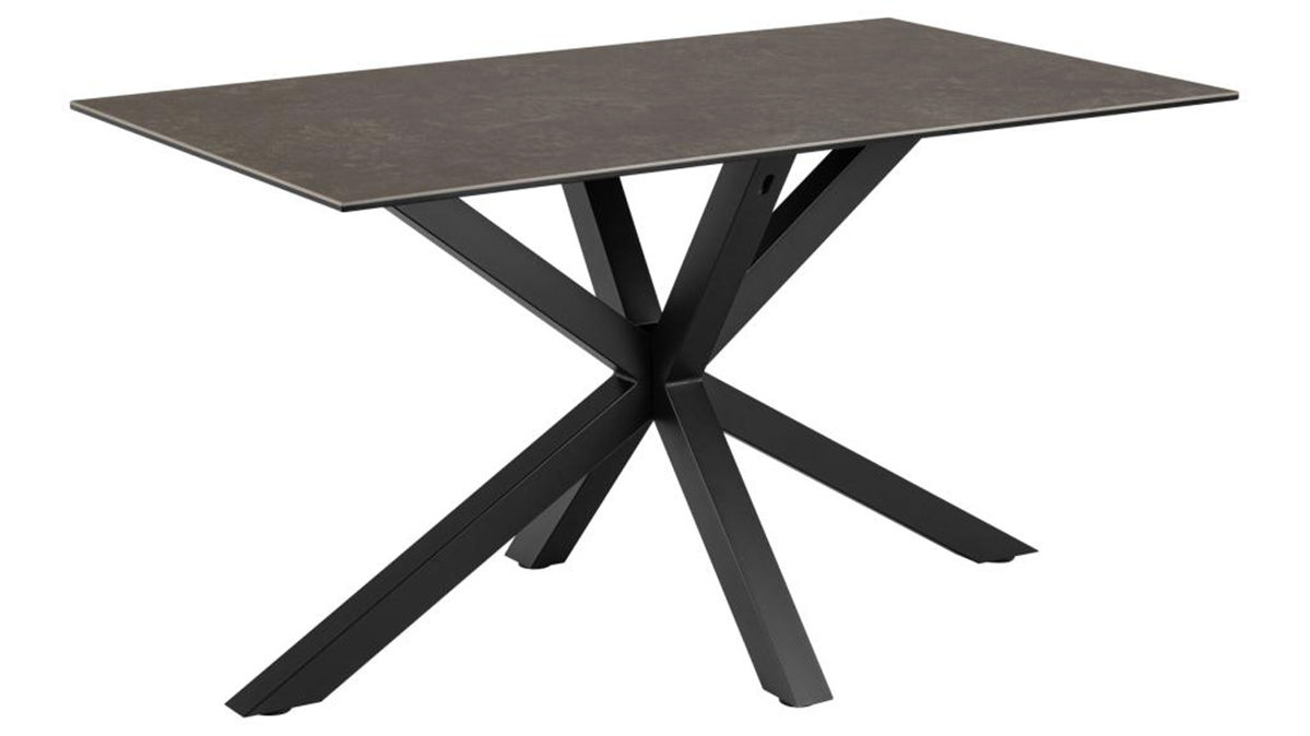 Der Tisch Heaven kombiniert ein Gestell aus mattschwarz pulverbeschichtetem Metall mit der schwarz marmorierten Keramik-Tischplatte Fairbanks auf einer schwarzen Glasplatte.