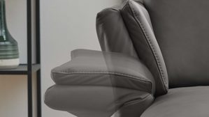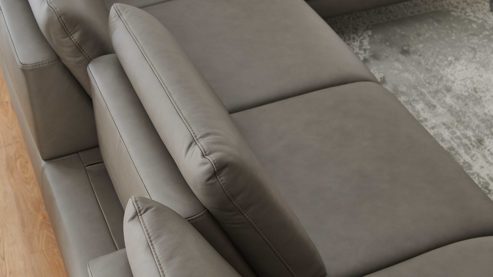 steingrauer Semi-Anilin-Lederbezug mit softem Griff und feiner Lederstruktur, kombiniert mit glänzenden Metallfüßen