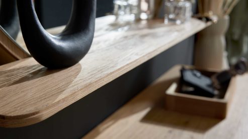 Der Wandspiegel mit Rahmen aus Wildeichefurnier und praktischem Ablageboden sorgt für natürliche Eleganz und zusätzlichen Komfort im Alltag. Mit Maßen von ca. 84 x 84 x 17 cm (BxHxT) ergänzt er das Set ideal.