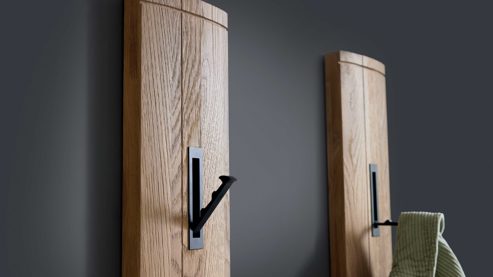 Zwei schmale Wandgarderoben mit je vier Klapphaken und kompakten Maßen von ca. 15 x 181 x 4 cm (BxHxT) runden das Set ab. Perfekt für schmale Flure oder kleine Dielen – platzsparend, modern und funktional.