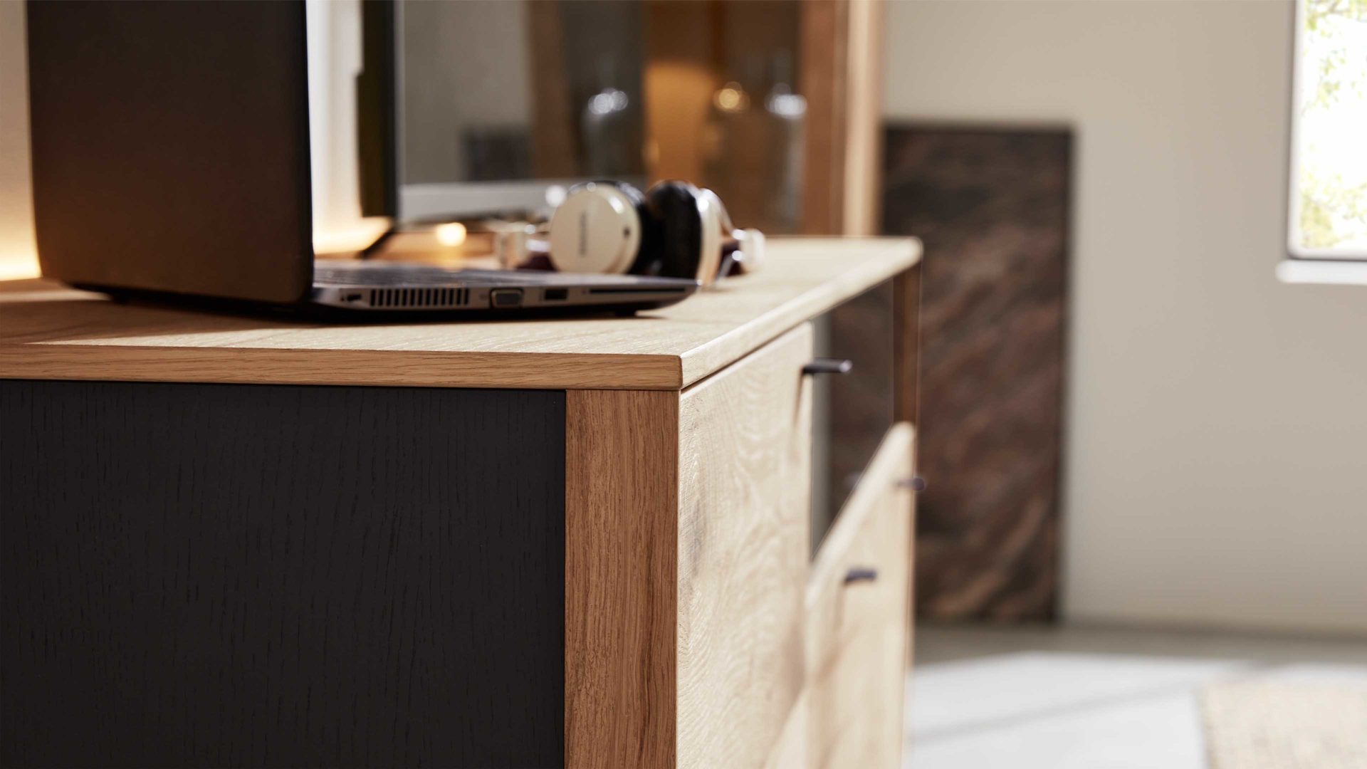 Das Medienmöbel der Interliving Esszimmer Serie 5604 kombiniert warmes, natürliches Design mit modernen Akzenten. Die Mischung aus hell geöltem Eiche-rustico-Echtholzfurnier, Korpus-Außenseiten und Schubladenblenden in matter anthrazitfarbener Eiche, matt anthrazitfarbenen Metallgriffen und grau getöntem Parsolglas verleiht deinem Wohnzimmer eine elegante, zeitgemäße Ausstrahlung.