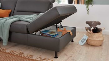 • Die Abbildung zeigt ein Wohnbeispiel, welches auch Dekoration sowie separat erhältliches Zubehör enthält. Im Lieferumfang enthalten ist ein Ecksofa.