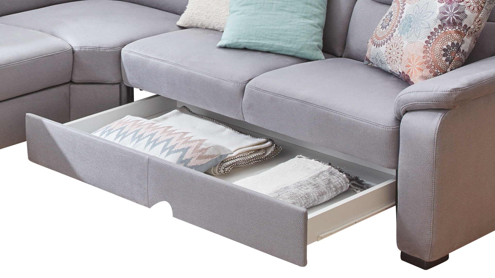 Dank der schlichten Griffmulde lässt sie sich leicht öffnen, ohne das Erscheinungsbild des Sofas zu stören. Im weiß beschichteten Innenraum können Sie etwa Decken und Zierkissen aufbewahren, wenn die Textilien gerade nicht benötigt werden.