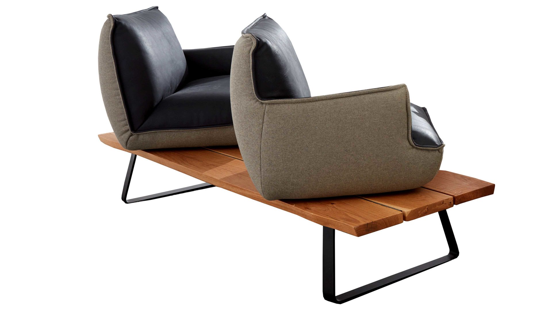 Als Basis fungieren ein mattschwarz pulverbeschichtetes Flachkufengestell mit Struktur sowie ein UV-beschichtetes Wildeichen-Plateau mit Öl-Effekt. Letzteres sorgt für eine natürlich-warme Note. Die beiden Sitzeinheiten der außergewöhnlichen Esszimmerbank sind innen mit dunklem Leder bezogen - außen weisen sie einen Lodenbezug auf.