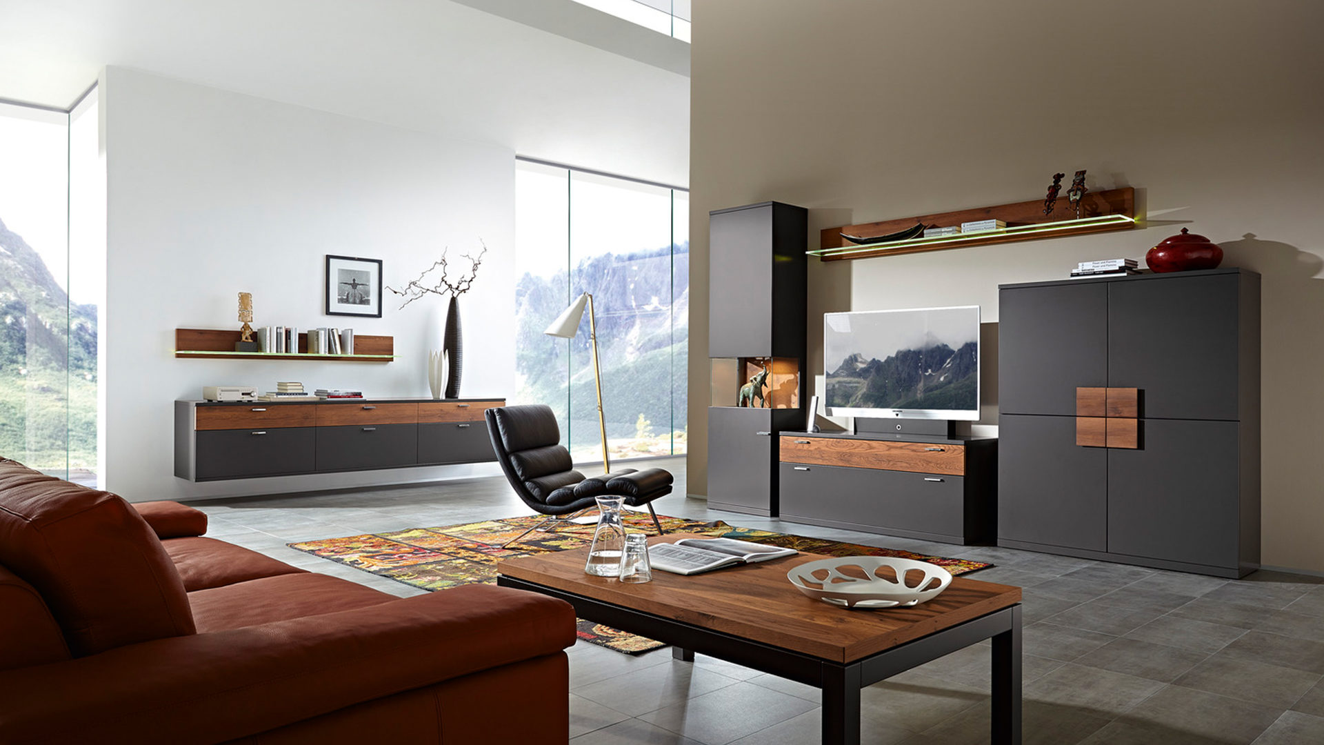 Bei der Vienna Wohnkombination präsentieren sich die Fronten und der Korpus mit hochwertigen Lackoberflächen in tiefgründig-eleganter Graphitfarbe. Akzente setzen die Details in geöltem Eichefurnier. Sie ergänzen warmen, natürlichen Charme und machen die Wohnwand noch attraktiver und einladender.