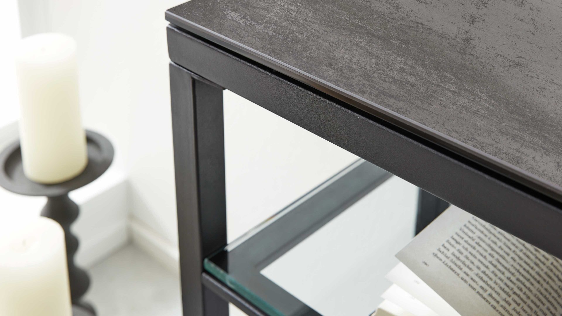 Die Tischplatte besteht aus 3 mm starker Keramik, die fest auf 6 mm Glas verklebt ist und so maximale Stabilität gewährleistet. Das Material ist kratz- und schlagfest, temperaturbeständig und damit optimal für den täglichen Gebrauch geeignet. Das schwarz lackierte Stahlgestell sorgt für hohe Belastbarkeit und unterstreicht die moderne Optik, während die 10 mm starke Glasablage robust, pflegeleicht und elegant zugleich wirkt.
