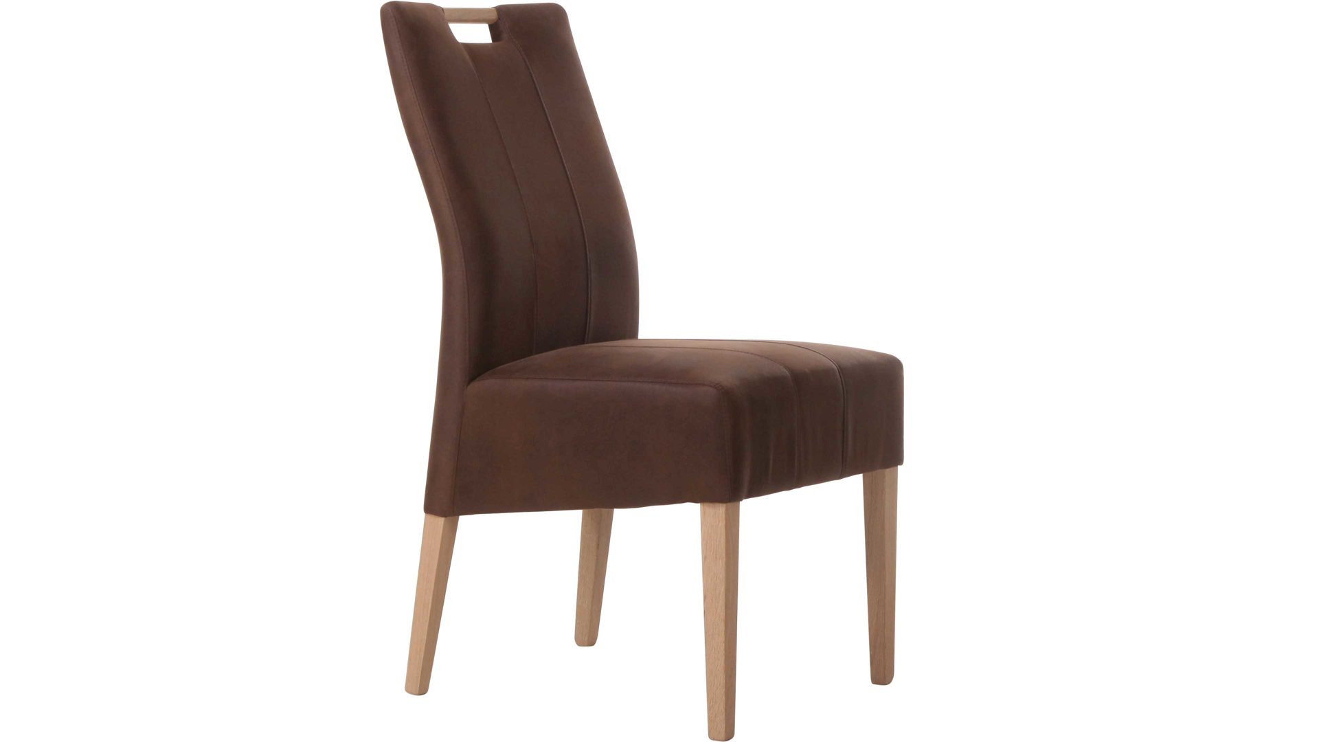 Der Vierfußstuhl Laura besteht aus einem geölten Eichenholzgestell als Basis und einer Sitzfläche, die mit dunkelbraunem Stoff bezogen ist. Durch die Materialien und die Farbgebung strahlt der Esszimmerstuhl Natürlichkeit gepaart mit moderner Eleganz aus. Die beigefarbene Kontrastnaht setzt einen stilvollen Akzent.
