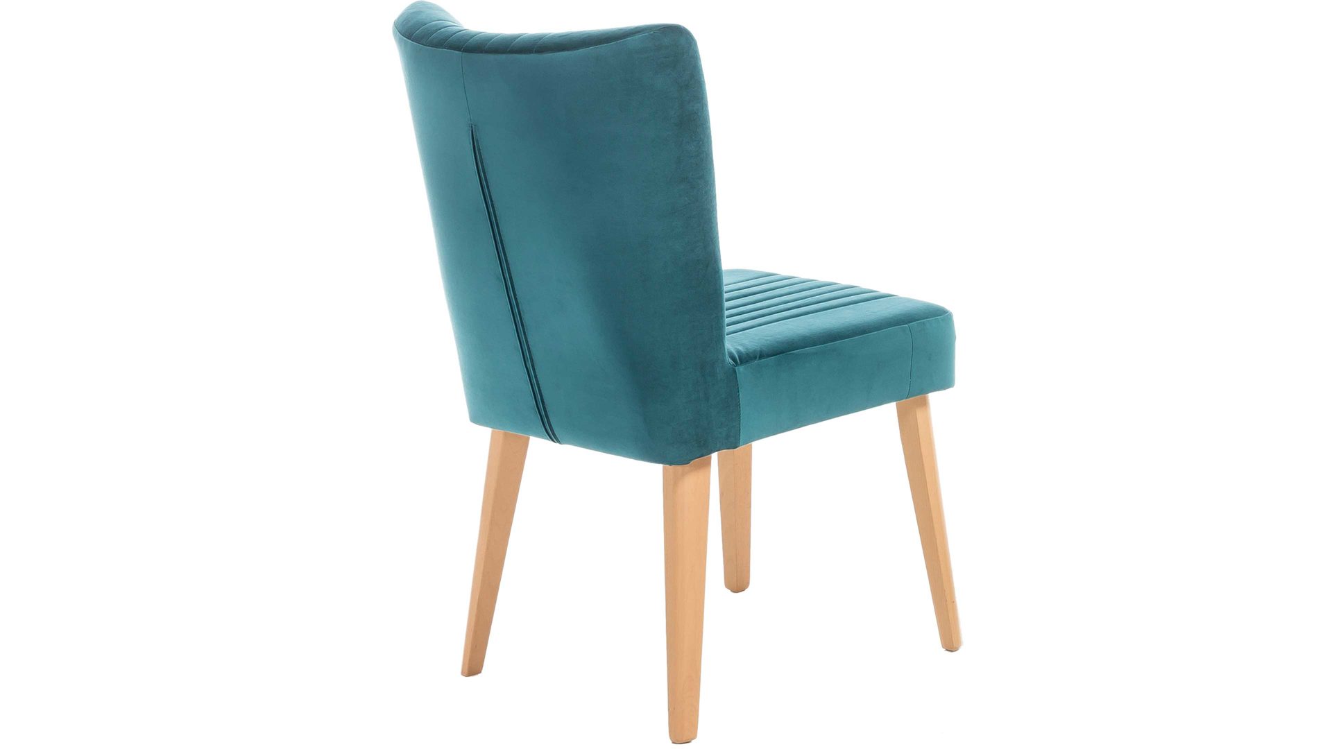 Ein farblicher Hingucker ist der hochwertige Polsterstuhl mit petrolfarbenem Bezug im modernen Samtlook. Aufwendige Steppnähte, die auf Sitz und Rücken angebracht sind, geben dem Sitzmöbel zusätzlich eine interessante Optik. Am besten passt der Polsterstuhl mit den Maßen von ca. 46 x 92 x 66 cm (BxHxT) an einen Esstisch aus Eiche, da auch das Holzgestell aus Eiche natur ist.