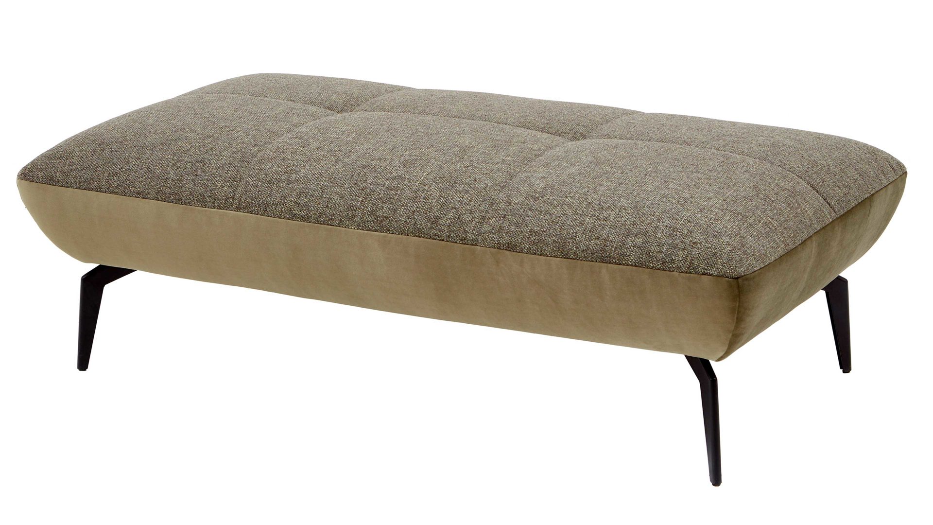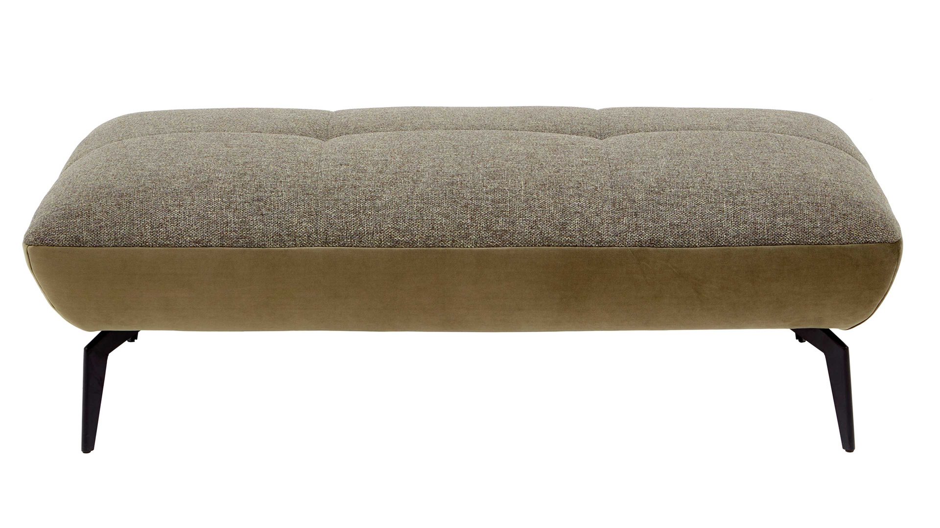 Die spezielle Kombination aus oliv- und khakifarbenen Stoffbezügen sorgt für ein edles Design. Mattschwarze Metallfüße runden die Optik stimmig ab und tragen überdies zur Stabilität des attraktiven Hockers bei. Einen gelungenen Akzent setzt die gesteppte Sitzfläche. Der Korpus des XXL-Hockers ist glatt bezogen.