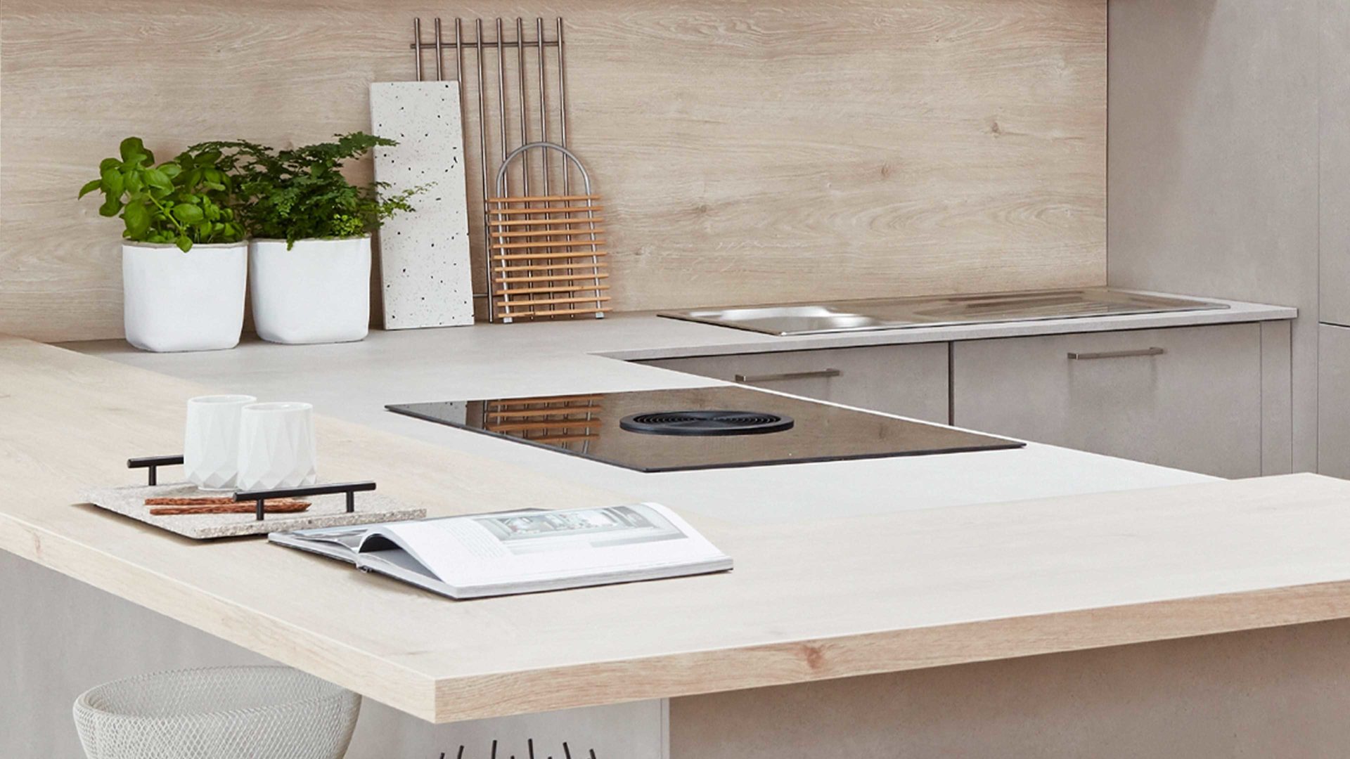 die großzügige Thekenlösung und das Induktions-Kochfeld mit Muldenlüfter. Überdies bieten die Küchenmöbel jede Menge Stauraum.
