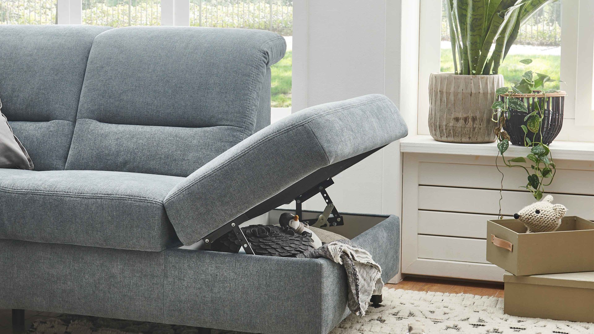 Die Aufklappfunktion ist ein praktischer Funktions-Mehrpreis für Elemente aus dem Modulmaster-Polsterprogramm MM-ZE1148. Sie bietet innen klassisch-weiß beschichteten Stauraum für Wohntextilien, Spielsachen und andere Gegenstände. Eingelassene Lüftungsschlitze sorgen für eine gute Belüftung. Zudem begeistert der Rasterbeschlag, der bequemes Öffnen und Schließen ermöglicht.