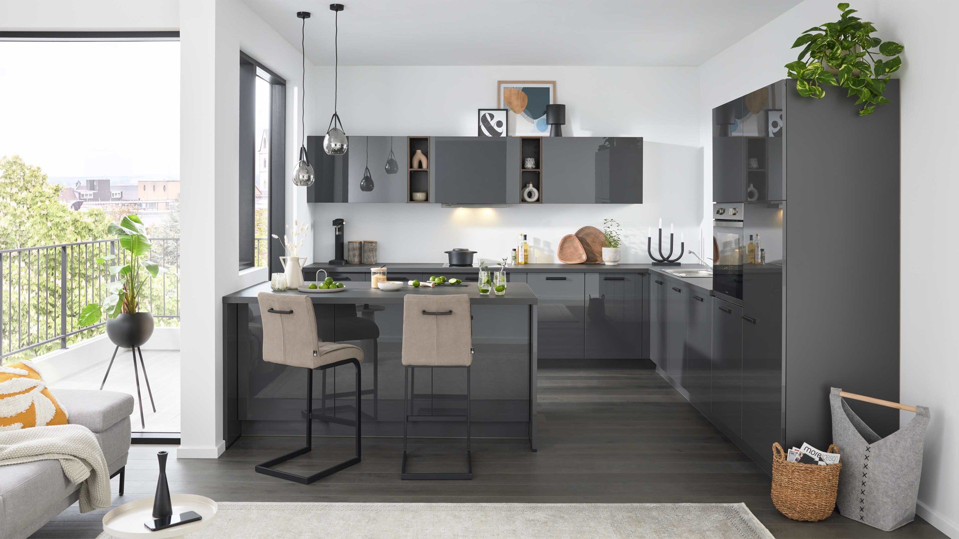 • Die Abbildung zeigt ein Wohnbeispiel, welches auch Dekoration sowie separat erhältliches Zubehör enthält. Im Lieferumfang enthalten sind eine Kücheninsel und eine Hochschranklösung.