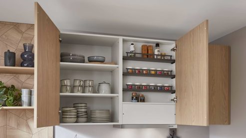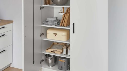 Ergänzt wird die Küchenzeile durch ca. 120 cm breite Hochschränke - für den Kühlschrank und viel Staumraum mit mit höhenverstellbaren Einlegeböden. Hier finden Vorräte, Geschirr und Küchenutensilien strukturiert ihren Platz – für mehr Ordnung und Übersicht im Alltag.